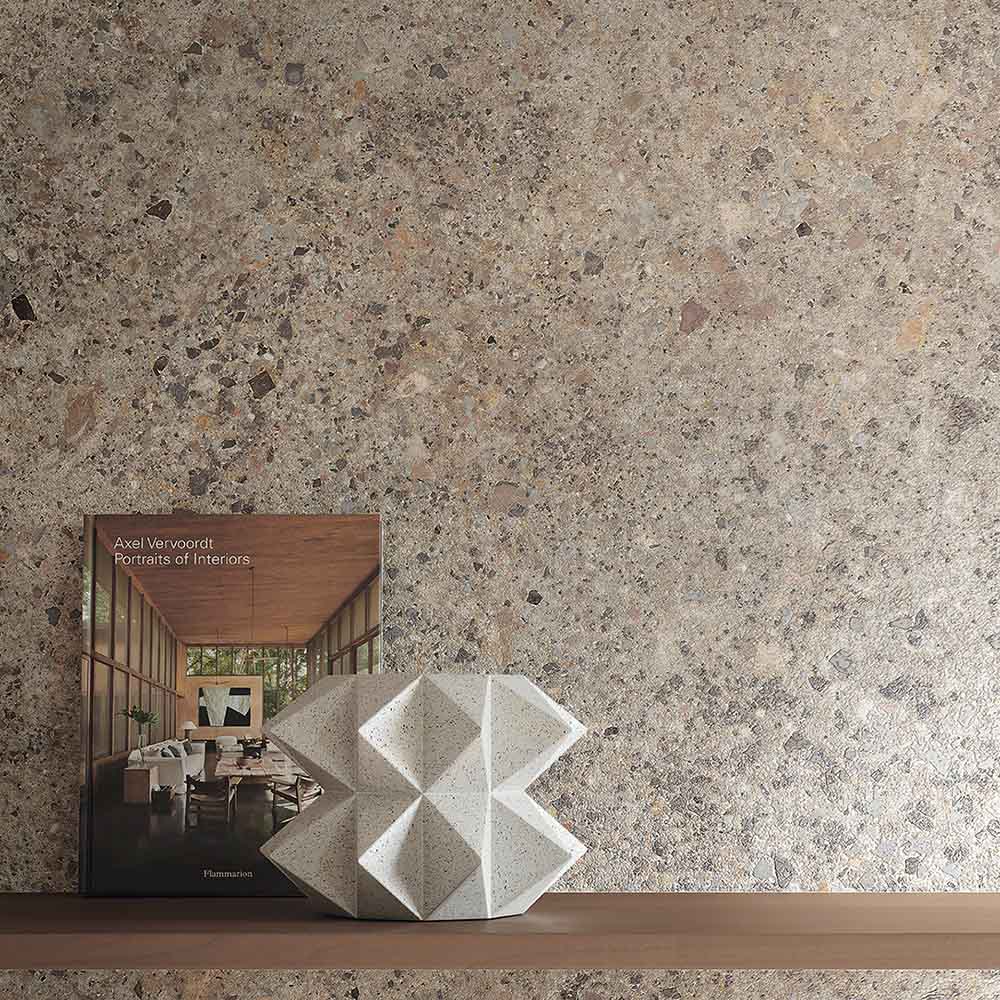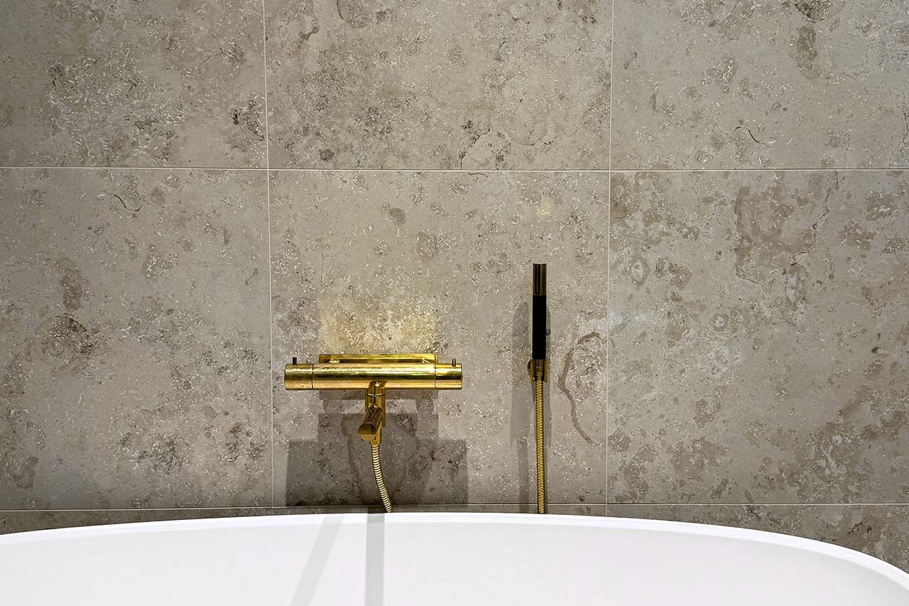 Nya Jura Terra, en granitkeramik med naturtroget Jura marmor utseende. Kommer i två olika kulörer i beige. Till badrummet på vägg och golv eller på golvet i kök, hall och tvättstuga.