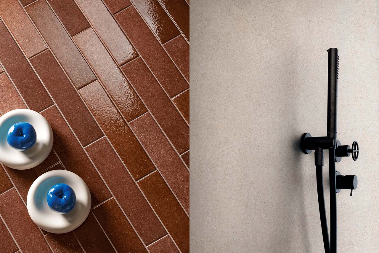 Serie Porta Nuova i rött och grönt och serie Sensi i vackra naturkulörer. Porta nuova 6,5x29 cm har ett retroutseende och sätts på vägg t ex fondvägg i badrummet. Sensi fungerar att sätta på vägg och golv, finns i tre kulörer och i storlek 80x80 och 60x120 cm